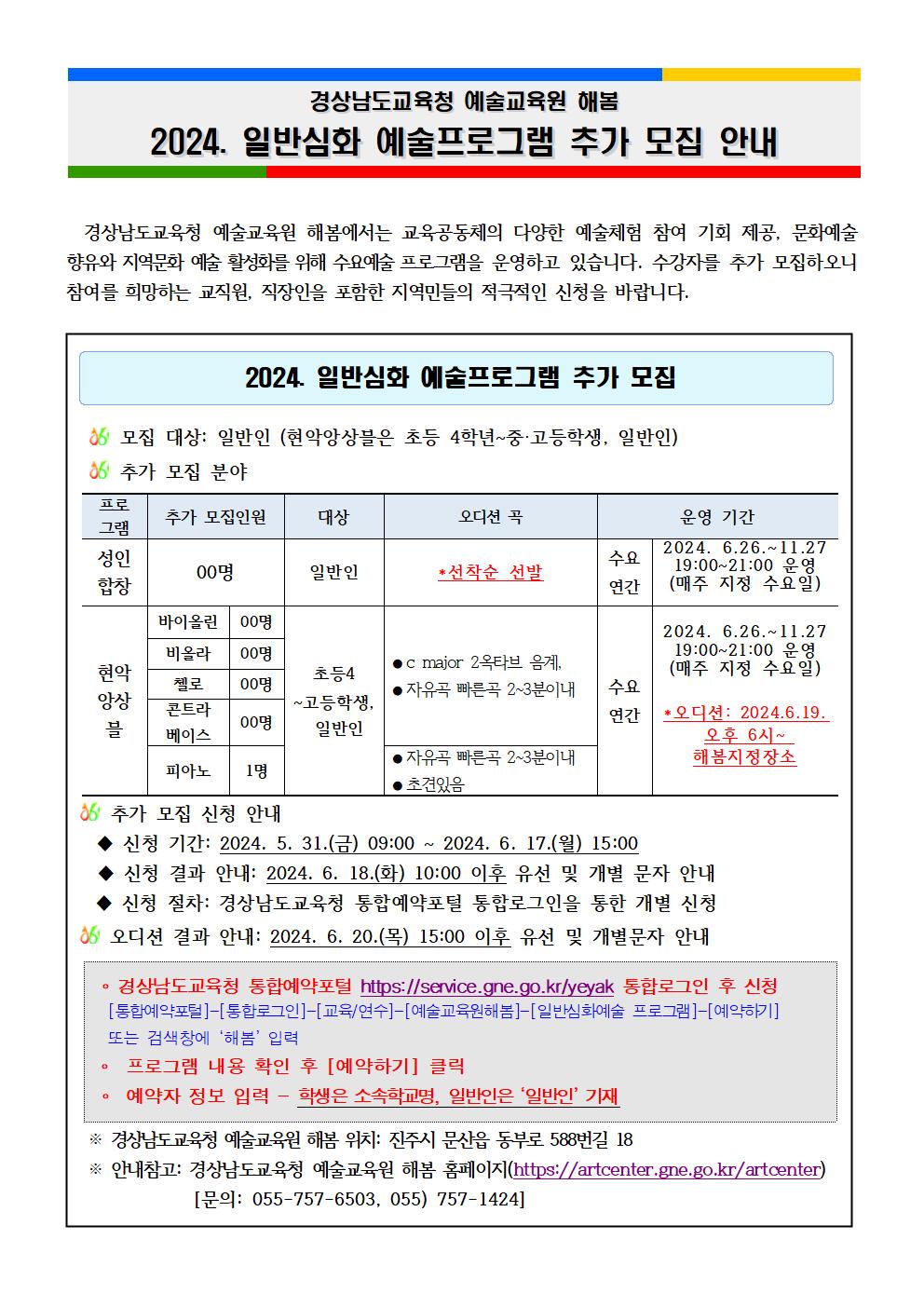 2024. 경상남도교육청 예술교육원 해봄 일반심화예술프로그램 수강자 추가 모집 안내