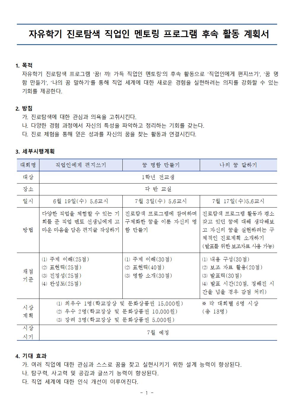 [1년] 자유학기 진로탐색 직업인 멘토링 프로그램 후속 활동 계획서