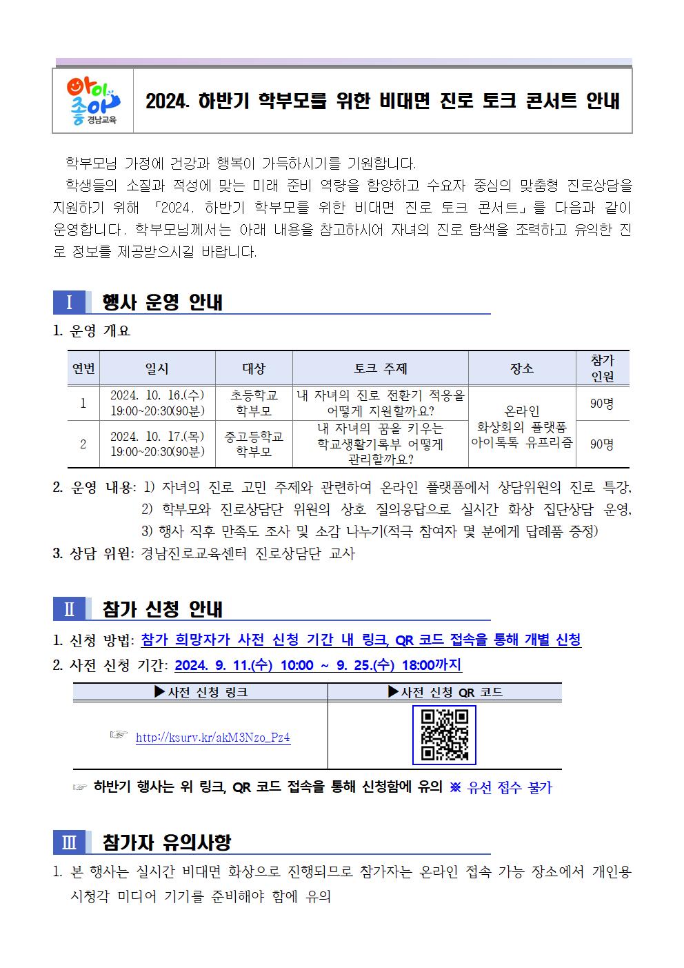 2024. 하반기 학부모를 위한 비대면 진로 토크 콘서트 참가 안내