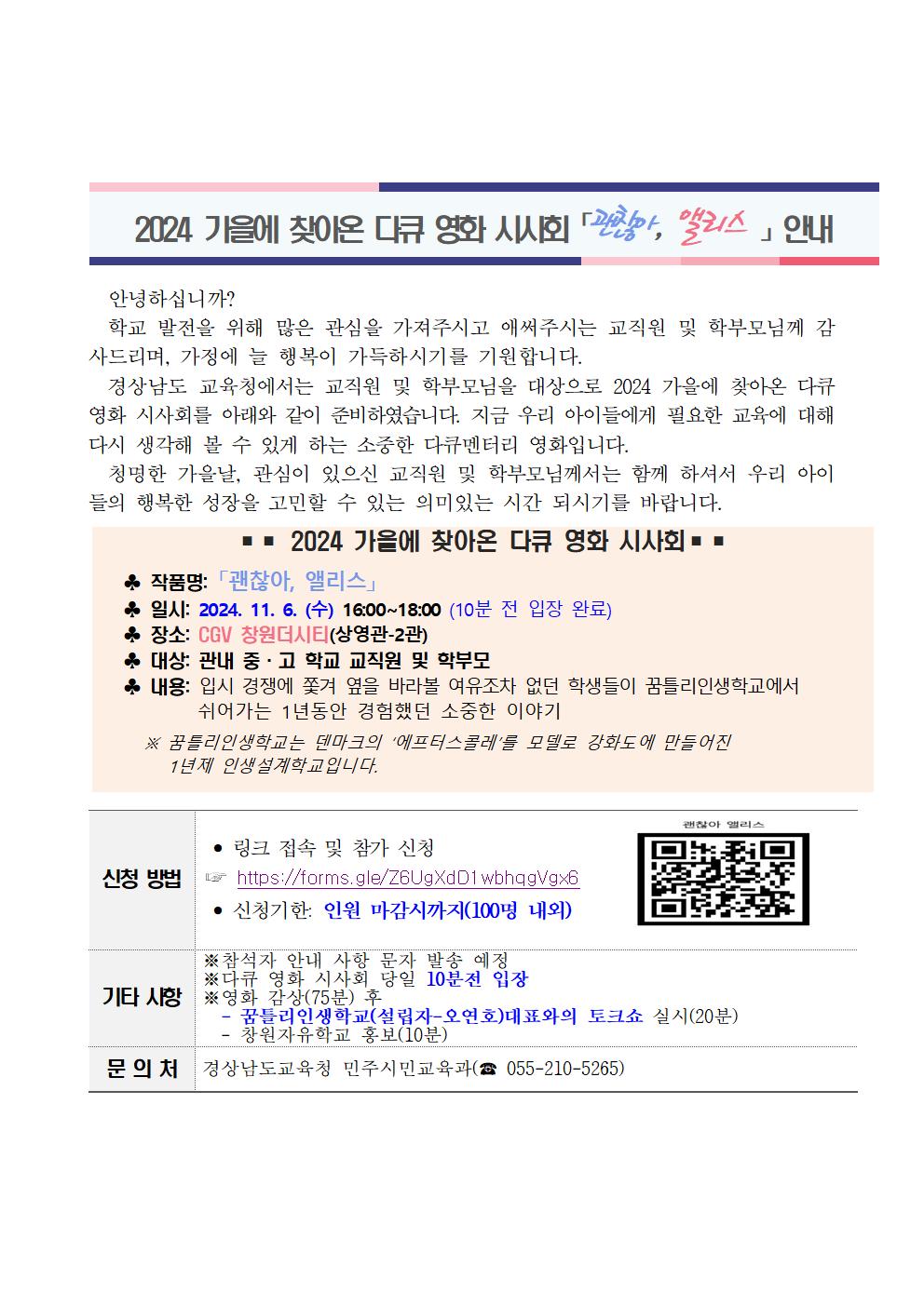 다양성 교육 실현을 위한 영화 "괜찮아 앨리스" 시사회 개최 및 신청 안내