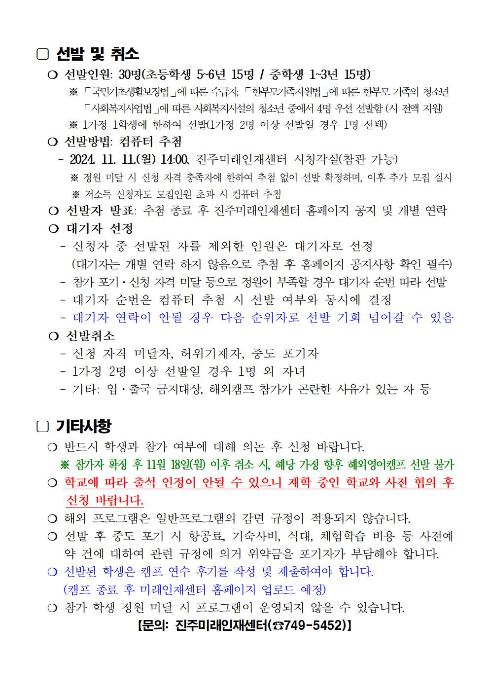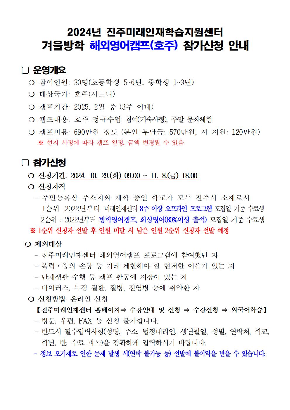 진주미래인재센터 2024년 겨울방학 해외영어캠프 모집 안내