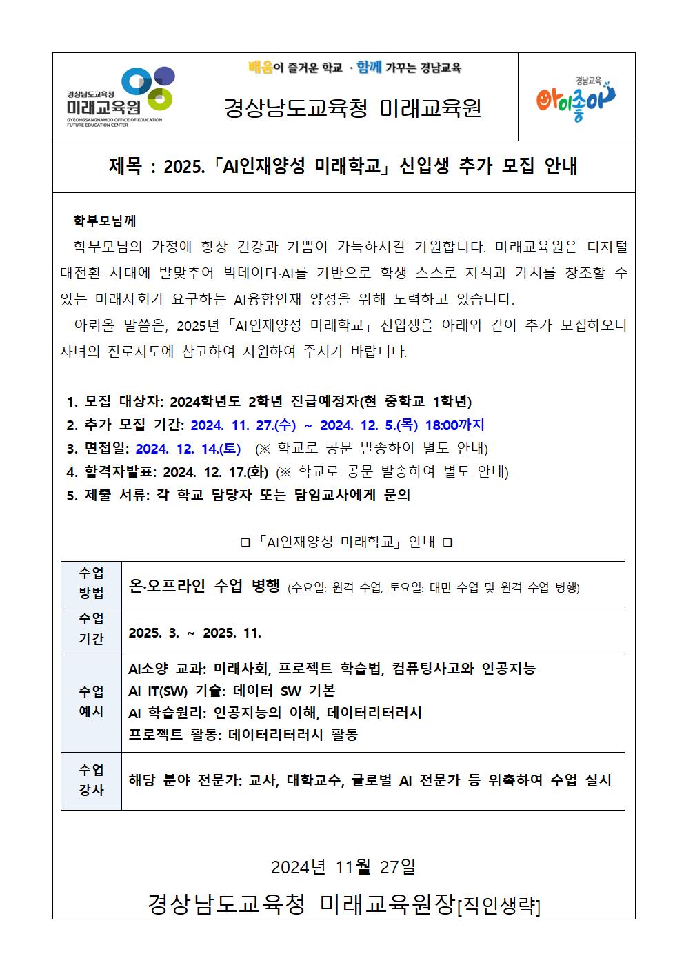 2025. AI미래인재양성 미래학교 신입생 추가 모집 안내