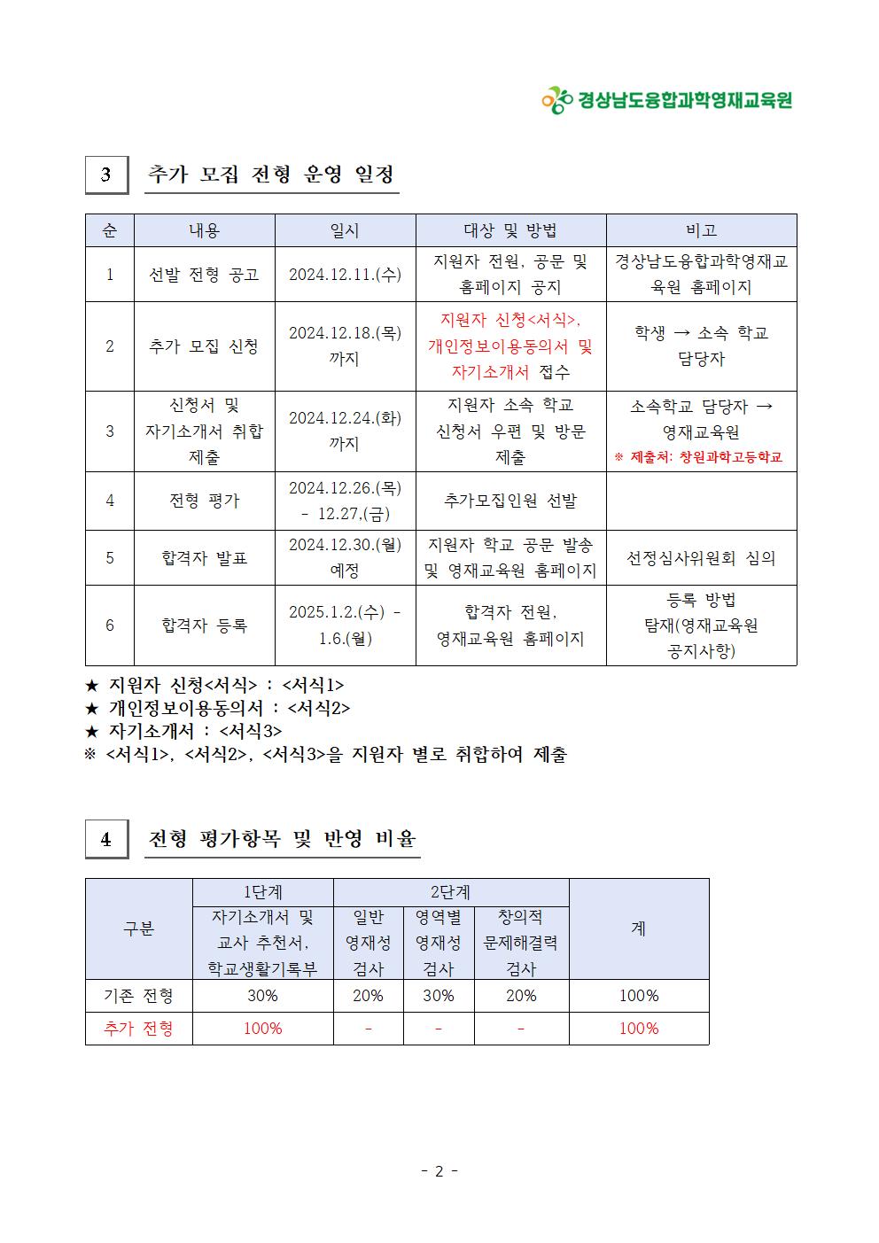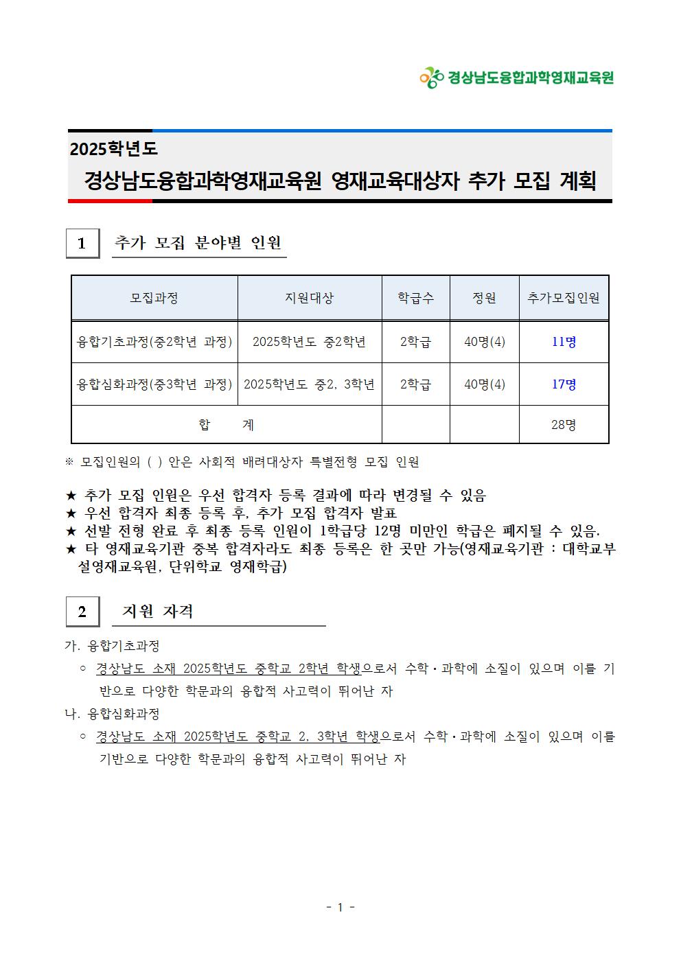 2025학년도 경상남도융합과학영재교육원 영재교육대상자 추가 모집 안내